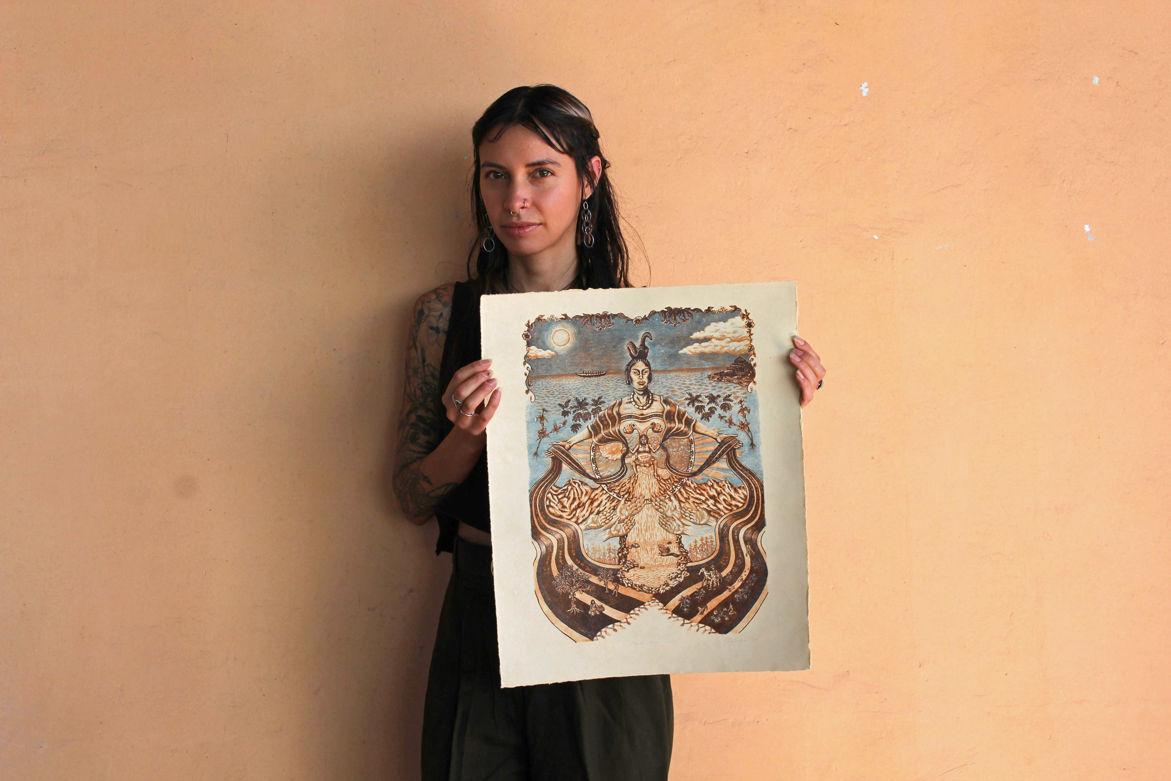 Asenath Lizárraga (b. 1991) is a Peruvian American visual artist raised in Washington state, and currently based in Olympia, WA. Their multidisciplinary art practice and curiosity of the natural world led them to the Evergreen State College where they graduated with dual degrees, a BA and a BS. Asenath primarily works in printmaking and oil painting, using symbolism and detailed overlapping scenes to convey stories exploring cultural connections to nature, magic, ancestry, and dream spaces in between the surreal and reality. They’re passionate about creating art that captures the beauty of Latin American culture, and that emphasizes the many points of cultural unity that exist across this vast continent that they have ancestral ties to. They screen print using a self taught multi-layer process, hand making their own screens, and building their own printing presses and exposure units. At an artist residency in Mexico in 2024 at La Ceiba Gráfica they explored the process of stone lithography for the first time and produced a series of prints which has inspired them to start seeking more opportunities to pursue lithography and broaden their experience with various forms of printmaking.